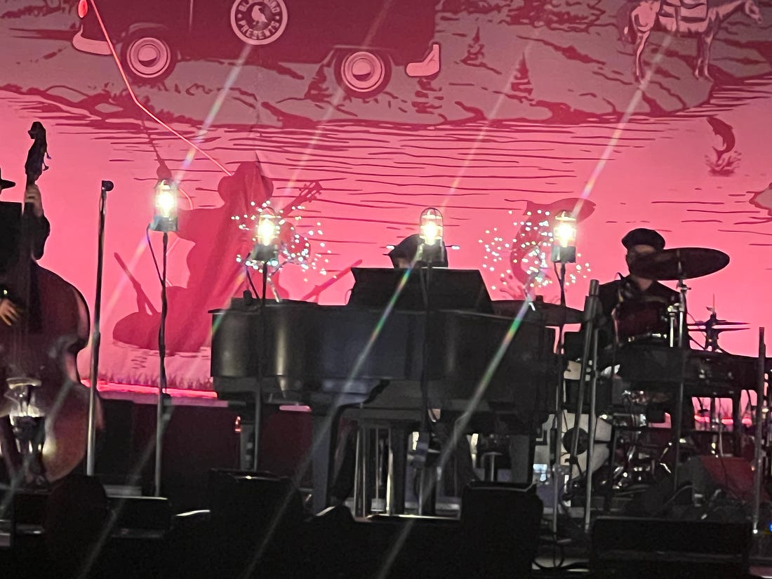 Two crazy tree-looking light fixtures sit on the piano, plus four standing light bulbs arrayed in front of him like soldiers guarding the king (brighter than they come across in photos—I have sensitive eyes and got a headache from looking into them). Plus he’s switched to a baby grand piano this leg, which has a music stand on top to hold his lyric sheets. On the off chance you can see around all the lights, that music stand blocks the lower half of his face. And, to take care of the upper half, he wears what looks like a raincoat with the hood up. I had a good seat, 15th row dead center, and that photo shows my view all night. I talked to people sitting in other sections afterwards, and his wall of barricades effectively prevents anyone from seeing him, anywhere in the venue. Just a top of a raincoat hood shifting around.